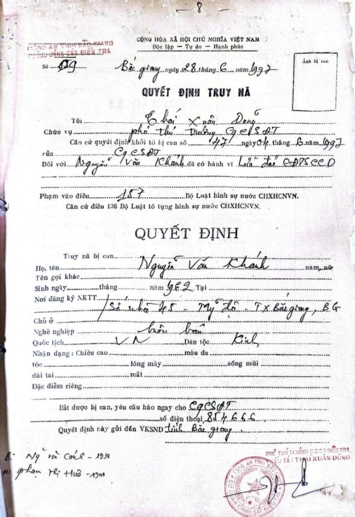 Hiện, Cơ quan Cảnh sát điều tra (CSHS) Công an tỉnh, đang thụ lý vụ án Nguyễn Văn Khánh, sinh năm 1962, nơi cư trú: Số nhà 45, đường Mỹ Độ, phường Mỹ Độ, thành phố Bắc Giang, tỉnh Bắc Giang (nay là phường Đa Mai, tỉnh Bắc Ninh) bị khởi tố về tội danh “Lừa đảo chiếm đoạt tài sản” quy định tại khoản 1, Điều 157, Bộ luật Hình sự năm 1985 (nay là Điều 174, Bộ luật Hình sự năm 2015, sửa đổi bổ sung năm 2017, 2024, 2025). Quá trình điều tra xác định bị can đã bỏ trốn, không biết đang ở đâu; ngày 28/6/1997, Cơ quan Cảnh sát điều tra Công an tỉnh Bắc Giang (nay là tỉnh Bắc Ninh) đã ra Quyết định truy nã số 09, đối với Nguyễn Văn Khánh về tội danh trên. Cơ quan Cảnh sát điều tra (CSHS) Công an tỉnh, kêu gọi Nguyễn Văn Khánh sớm ra đầu thú, để được hưởng chính sách khoan hồng của pháp luật.