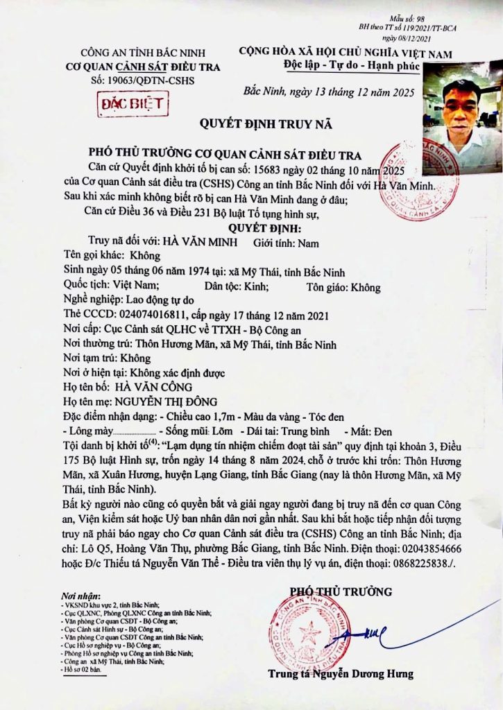 Hà Văn Minh bị Cơ quan Cảnh sát điều tra Công an tỉnh Bắc Ninh truy nã đặc biệt nguy hiểm về hành vi “Lạm dụng tín nhiệm chiếm đoạt tài sản” quy định tại Khoản 3 Điều 175 Bộ luật Hình sự.