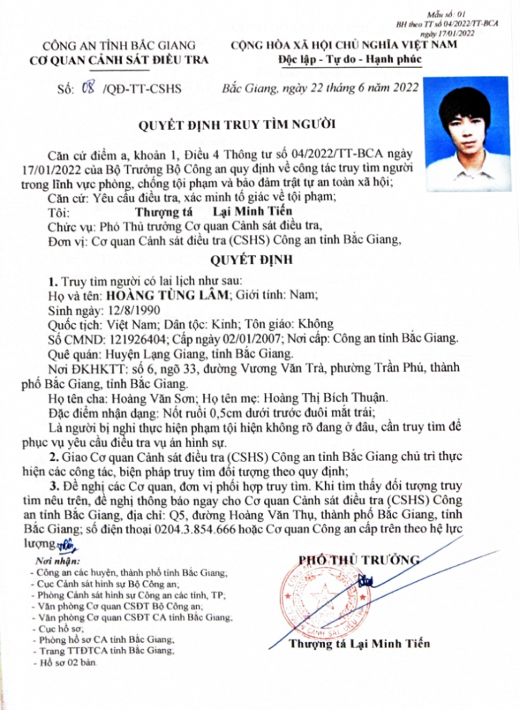 Quá trình xác minh, do chưa xác định được người nghi vấn phạm tội đang ở đâu? nên ngày 22/6/2022, Cơ quan Cảnh sát điều tra, Công an tỉnh, đã ra Quyết định truy tìm người đối với Hoàng Tùng Lâm, sinh năm 1990, trú tại số 6, ngõ 33, đường Vương Văn Trà, phường Bắc Giang, tỉnh Bắc Ninh.