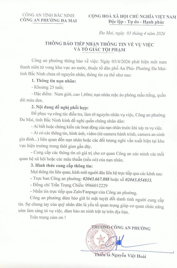 - Công an phường Đa Mai thông báo tiếp nhận thông tin về vụ việc và tố giác tội phạm