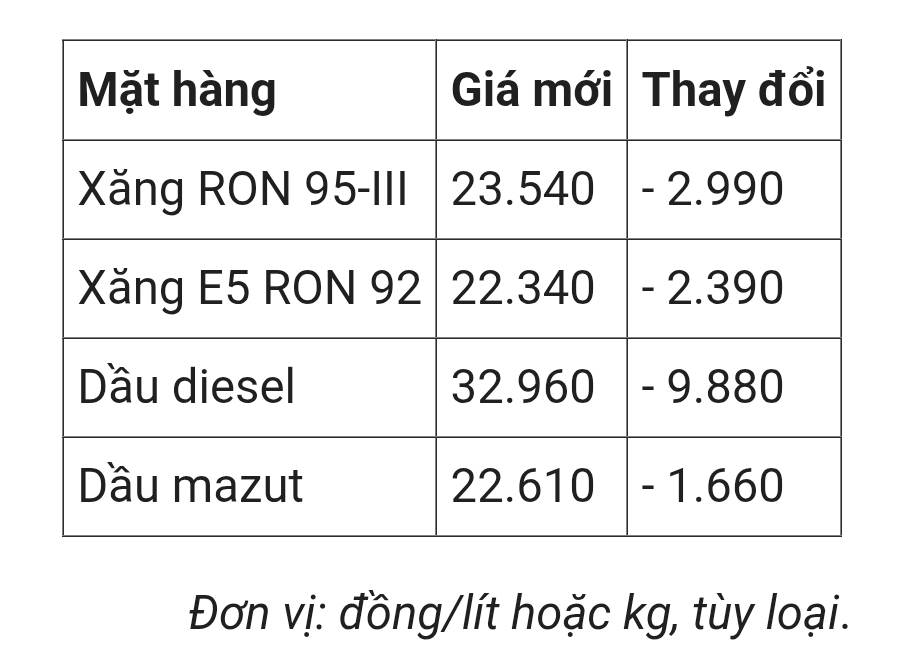 Theo điều chỉnh của Liên bộ Công Thương – Tài chính, giá xăng RON 95-III (loại phổ biến trên thị trường) giảm 2.990 đồng, còn 23.540 đồng một lít. Tương tự, E5 RON 92 hạ 2.390 đồng, có giá mới 22.340 đồng.