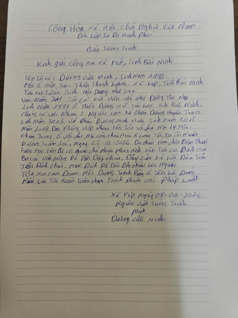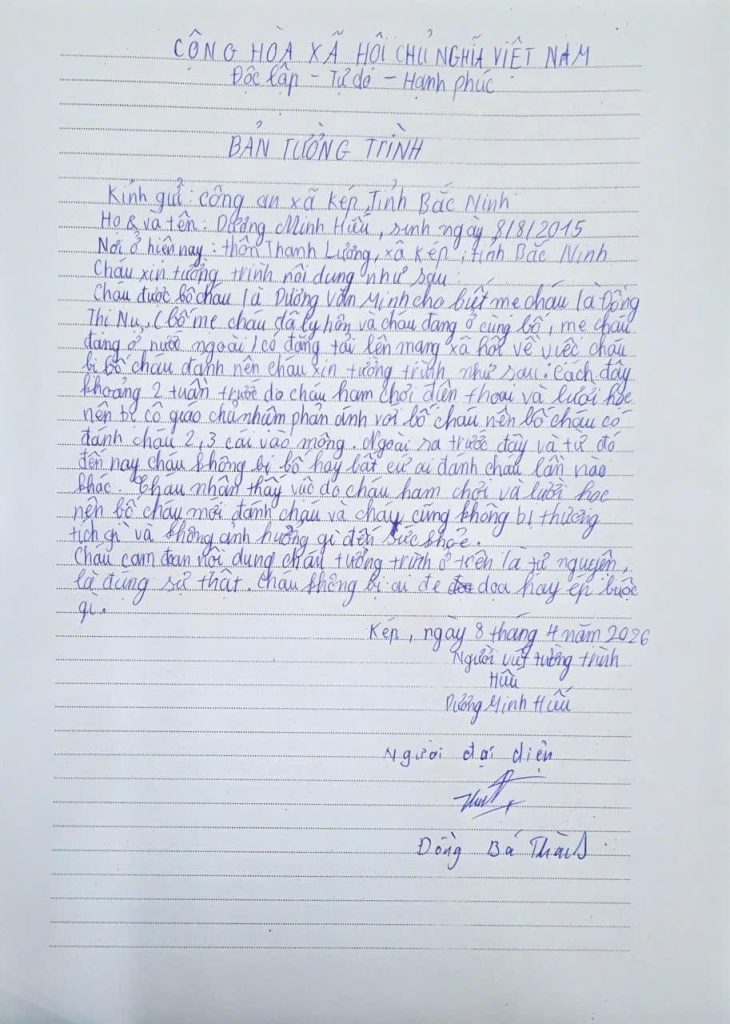 Ngày 08/4/2026, Công an xã Kép đã tiến hành làm việc với cháu Dương Minh Hiếu ở thôn Thanh Lương, xã Kép, tỉnh Bắc Ninh để xác minh làm rõ thông tin vụ việc phản ánh cháu bị người thân đánh gây thương tích.